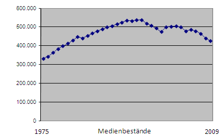 Die Entwicklung der Medienbestände könnte eine Ursache bieten für die Notwendigkeit zu einem Bibliotheksneubau. Die Darstellung der Gesamtbestände der Stadtbibliothek (nicht nur Standort Blücherstraße) weist in der Zeit von 1975 bis einschließlich 2009 die Entwicklung auf, die in der nachfolgenden Grafik dargestellt ist. Diese Entwicklung erfordert eine differenzierte Betrachtung, wenn sie als wichtige Grundlage für eine verantwortbare Entscheidung dienen soll.