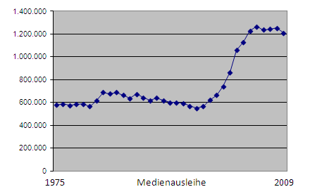Die Entwicklung der Ausleihen im Zeitraum von 1975 bis 2009 ist ebenfalls für sich betrachtet keine Entscheidungshilfe. Auch hier ist eine differenzierte Betrachtung nötig, die auch den Ausleihbetrieb der Nebenstellen berücksichtigt.