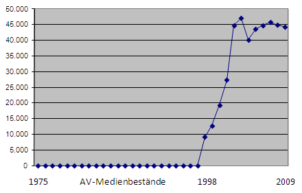 Die Entwicklung des Bestandes der AV-Medien ist in den städtischen Statistiken seit 1998 berücksichtigt. Die Bestände an neuen Medien liefern aber auch keine Erkenntnis, die ohne Interpretation zu einem Ergebnis führt.